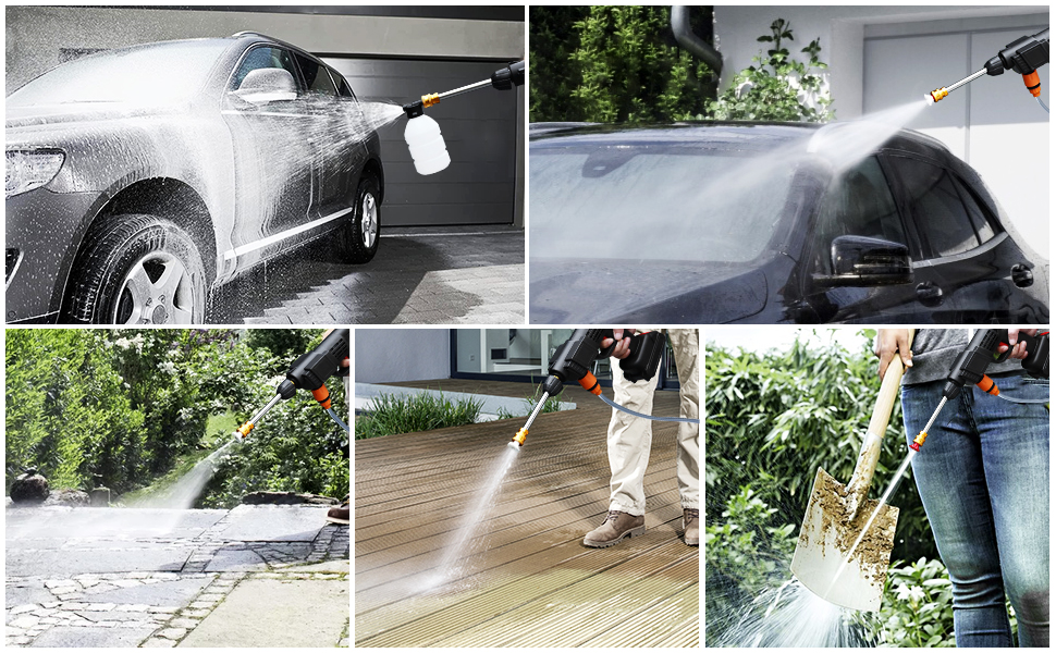 - MULTIPLE-FUNCTIONS AND APPLICATION - Cleaning and maintenance of various motor vehicles and agricultural machinery supporting products. Our pressure washer gun is effective especially for cleaning the exterior walls of buildings, floors, baths, swimming pools, doors and windows, and corners that are difficult to clean manually. It is the best pressure washer machine for outdoor camping and long trips.