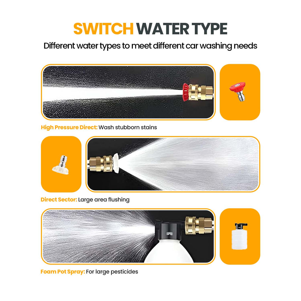 - MULTI-FUNCTION NOZZLE - Our high power cleaner has a nozzle, which refers to 0 °, 40 °, foam and shower modes. Foam mode is more effective for stubborn stains on the surface of the object, just add detergent to the foam bottle, this multi-function washing gun makes your cleaning more convenient and easier than normal cleaning